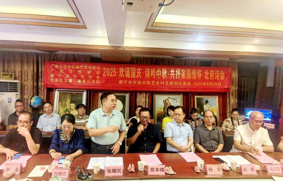 随后举行的2025壮府诗会诗意盎然,充满欢声笑语。容本镇、张耀民、杨合、刘春、丘晓兰、黄鹏、冯三四、李宗文、杨辉、韦毓泉等30多名作家、诗人、文艺家参加诗会活动。主持人方小罗、钟柳和与会诗人现场朗诵原创诗作,以诗歌的名义“欢诵国庆,诗吟中秋,共抒家国情怀”。